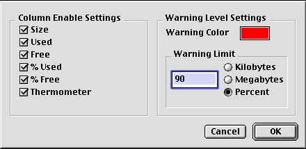 Many of the features of Drive Monitor can be contoled via the settings dialog. The "Column Enable Setting" controls which of the columns are visible in the main display window. The "Warning Level Setting" allows the user to select the hilite color and the threshold for using the hilite.