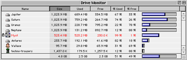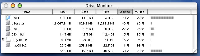 Drive Monitor is a free utility for the Macintosh that allows you to easily view the status of all of the volumes mounted on your desktop.